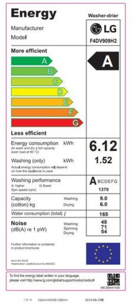 - Energia felhasználás, mosás+centrifugálás+szárítás (kWh/ciklus): 6.12